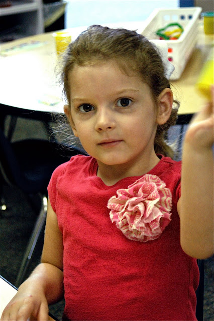 Teacher's Aide was there to greet us at the door. She's just precious. MW went right in, put her snack in the snack bucket, hung her bag on her hook, and sat right down in her spot. She cracked open a can of play-dough and used a cookie cutter to cut out the letter H, which she proceeded to hold up to her eyes and make believe it was binoculars. I snapped a few pics and half way wanted her to cling to me and beg me not to leave, but she didn't. She gave me a kiss and told me she did "not have a crush on that boy" and pointed to a kid behind her.