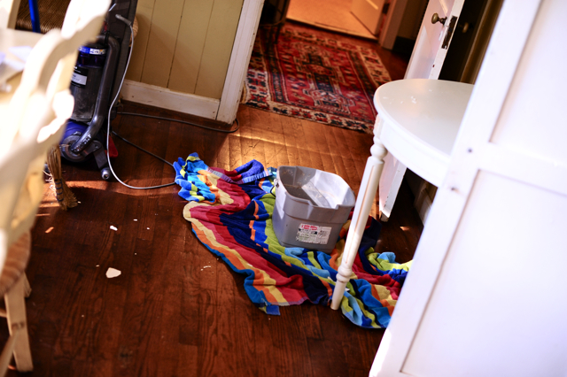 No pre-party prep is complete without a roof leak. Lovely. It had dried by party night, but we still had a small strip of ceiling dangling during the party. Festive, eh? The lights were low. I'm not sweating it. Whatever.